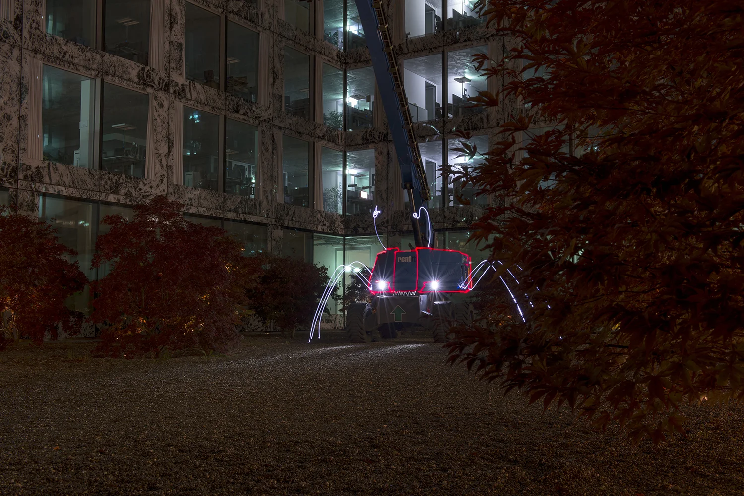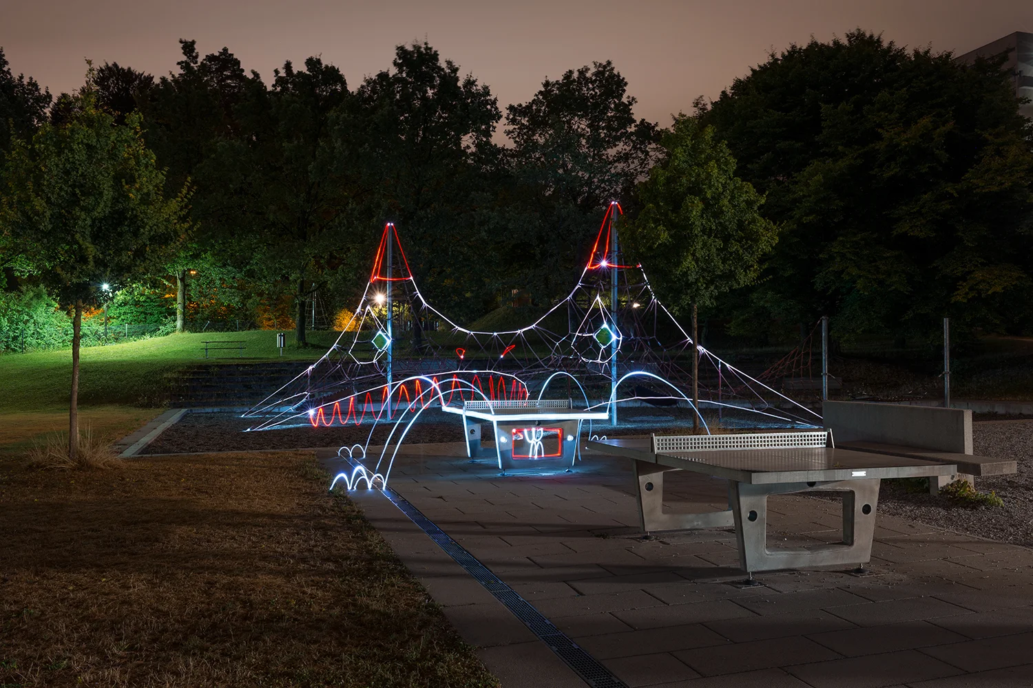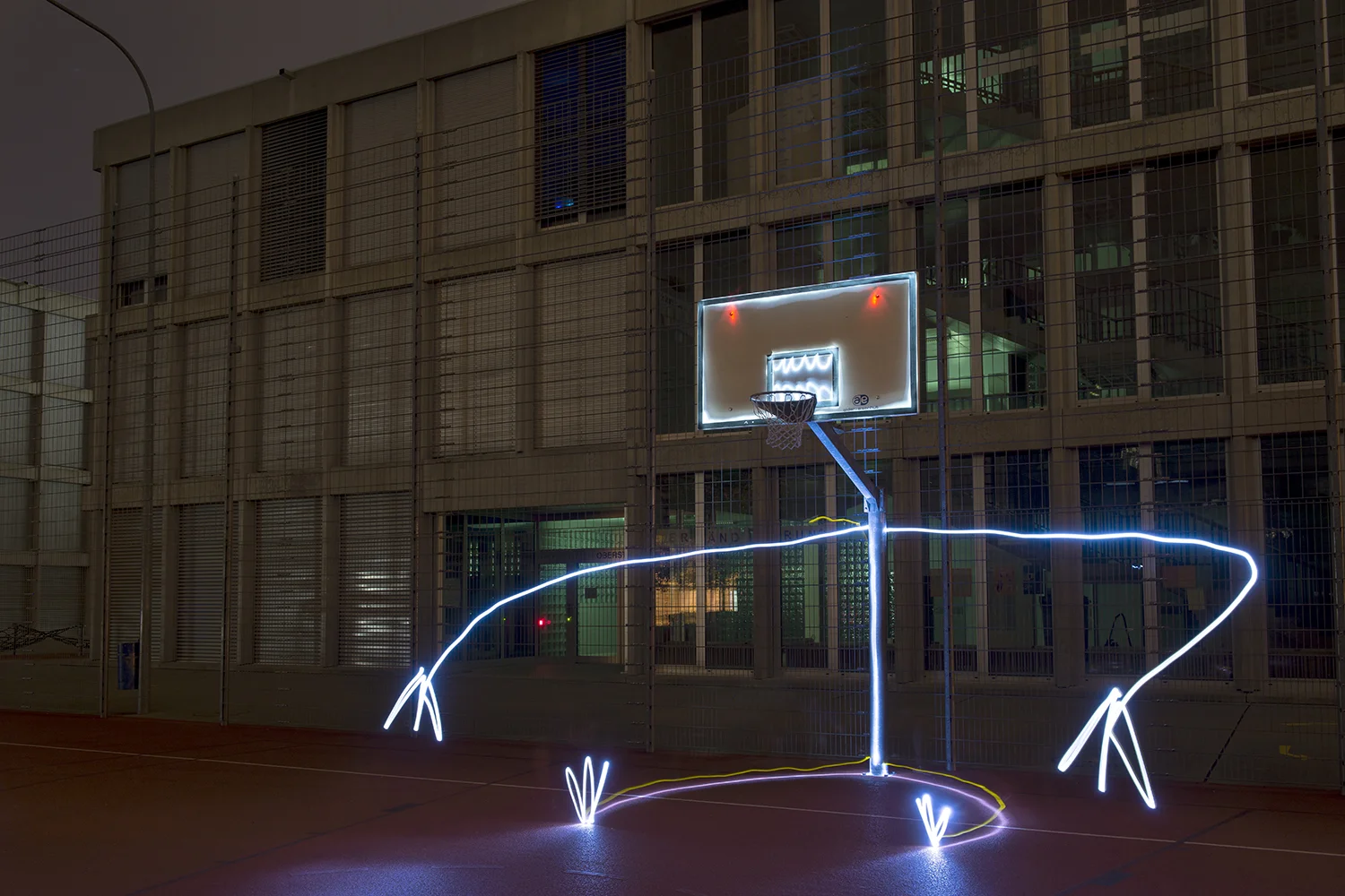 Lukas Kreuzer und Samuel Rauber dokumentieren in Lighture (2010-15) ihre fotografische Auseinandersetzung mit urbaner Landschaft. Sie reagieren zeichnerisch-performativ auf Umgebungen, die das architektonische Stadtbild der Schweiz zunehmend prägen: Grossüberbauungen, Wohnsiedlungen, Verkehrsräume, Designerspielplätze. Hier hinterlassen sie Spuren, die nur durch das fotografische Verfahren der Langzeitbelichtung sichtbar werden. Durch ihre Figuren, mit verschiedenen Lichtquellen erweckt, hauchen sie scheinbar verlassenen Orten Leben ein.